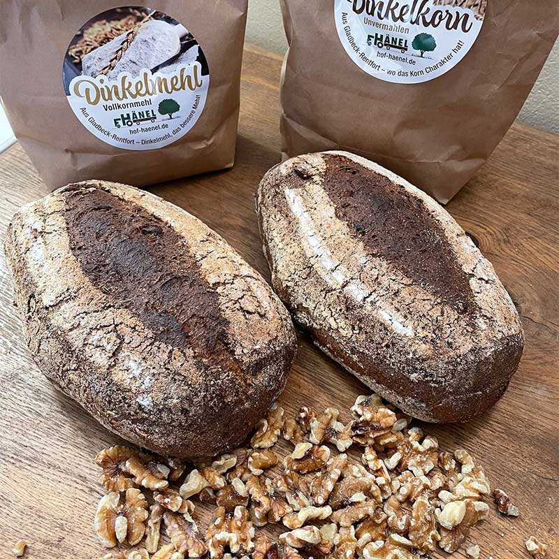 Zutaten: Dinkelvollkorn1, Dinkelmehl1, Sauerteig1, Walnüsse8, Salz, Hefe, Wasser, Walnussöl8